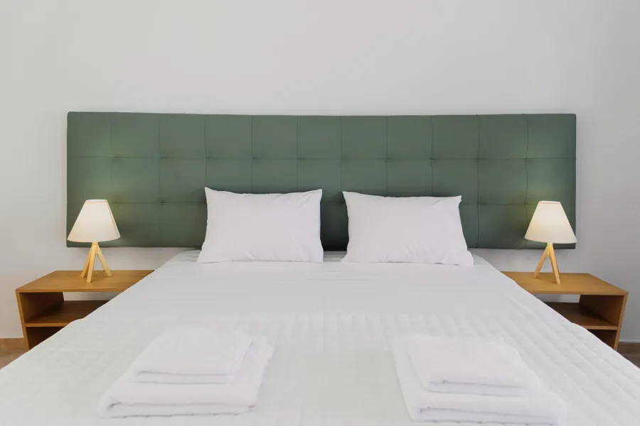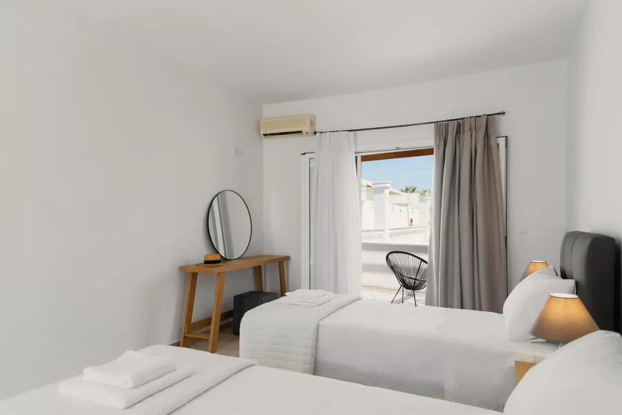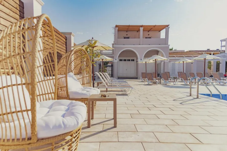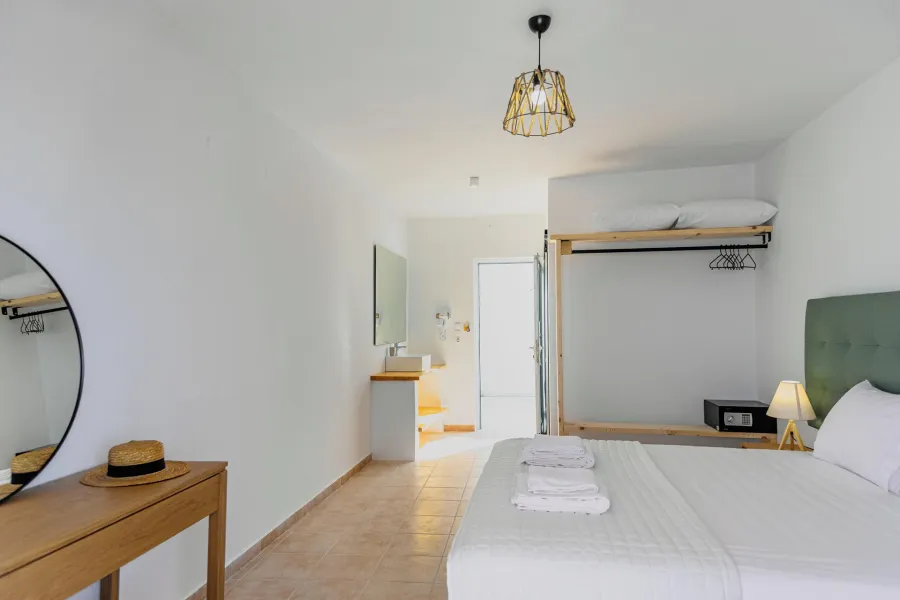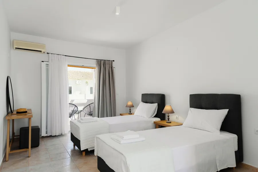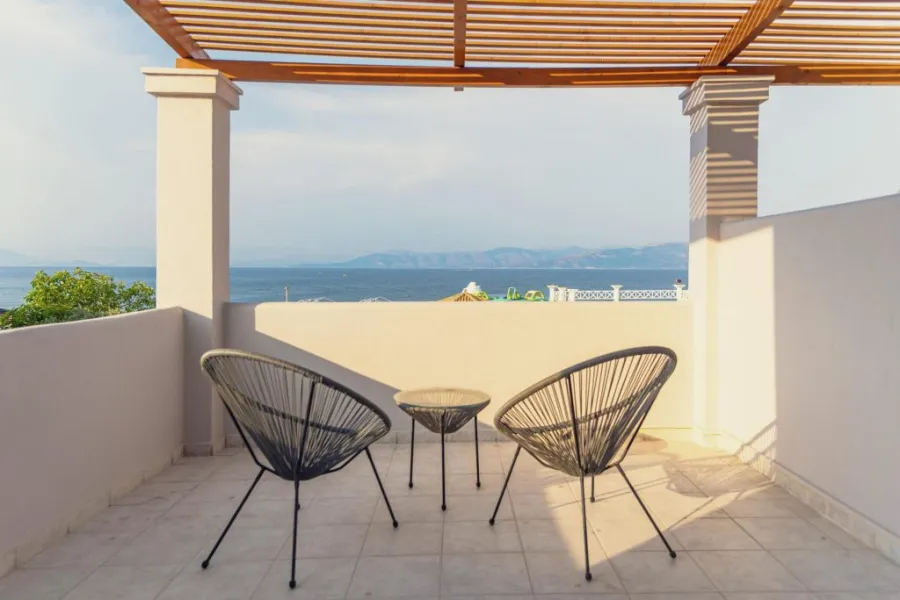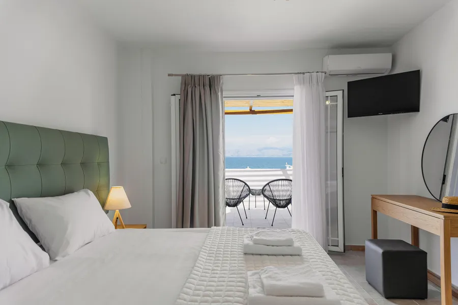 Hotel raspolaže sa luksuznim dvokrevetnim i trokrevetnim sobama i 2 apartmana sa pogledom na more i bazen. Sobe su prostrane i udobne. Dva apartmana imaju pogled na bazen i dodatno prelep bočni pogled na Jonsko more i grčku obalu. Oprema soba uključuje besplatan klima uredjaj, sopstveno kupatilo sa tušem i fenom za kosu, klima-uređaj, frižider, TV od 32 inča i besplatan Wi-Fi. Apartmani dodatno imaju aparat za kafu/čaj.
